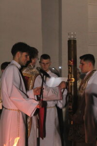 W dalszej części liturgii słuchaliśmy historii zbawienia, odnowiliśmy przyrzeczenia chrzcielne oraz uczestniczyliśmy w uroczystej Eucharystii.