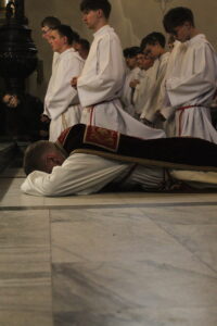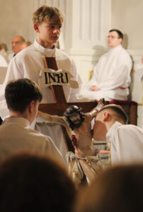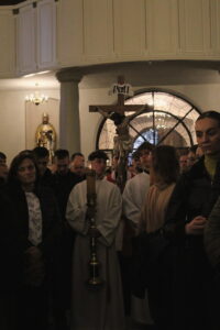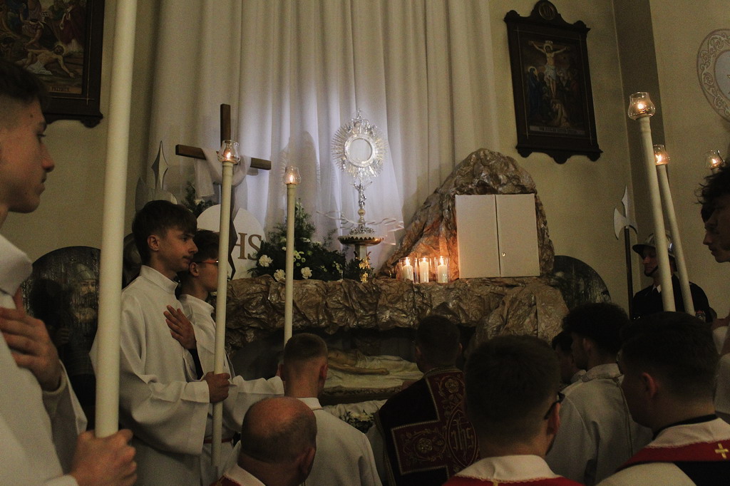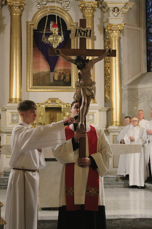 Zgromadziliśmy się na Liturgii Męki Pańskiej, podczas której wsłuchiwaliśmy się w opis Męki Chrystusa, adorowaliśmy Krzyż oraz przyjęliśmy Komunię Świętą. Szczególnym momentem była również Droga Krzyżowa, która pomogła nam jeszcze głębiej wejść w tajemnicę cierpienia i miłości Chrystusa.Na zakończenie Najświętszy Sakrament został przeniesiony do Grobu Pańskiego, gdzie trwaliśmy na modlitwie i adoracji.